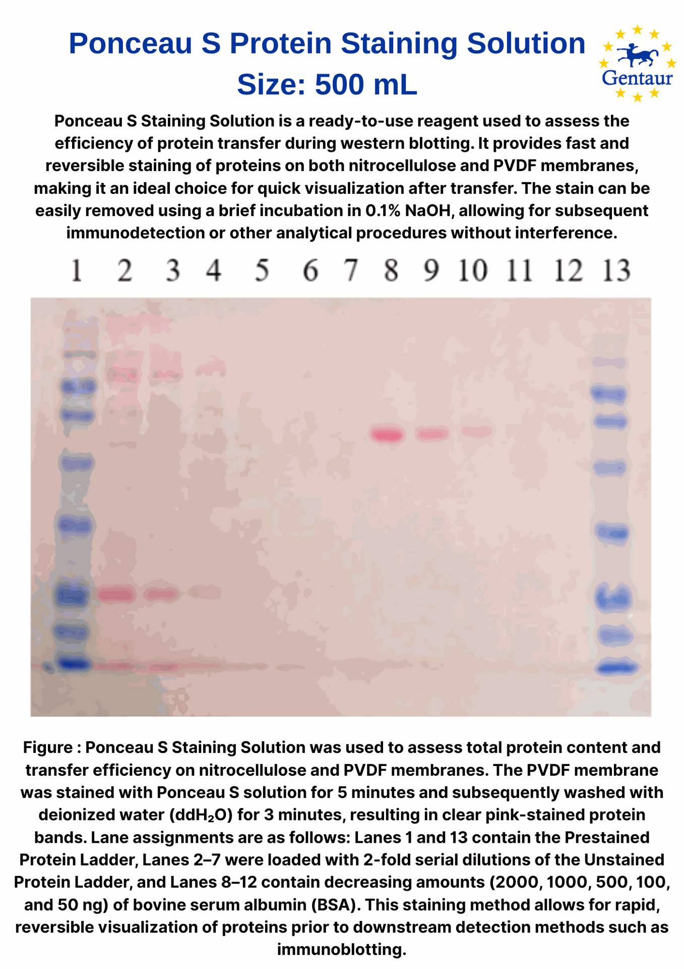 - Reversibel färgning: Ponceau S erbjuder reversibel färgning, vilket möjliggör borttagning av färgen efter proteinvisualisering, vilket gör den idealisk för membrananalys.